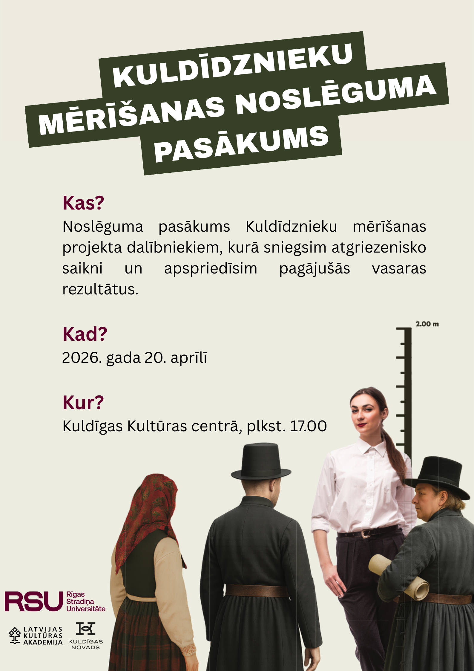 Rīgas Stradiņa universitāte (RSU) sadarbībā ar Latvijas Kultūras akadēmiju un Kuldīgas novada pašvaldību aicina visus pētījuma dalībniekus un interesentus uz antropoloģiskā pētījuma noslēguma pasākumu 20. aprīlī Kuldīgas kultūras centrā plkst. 17.00.