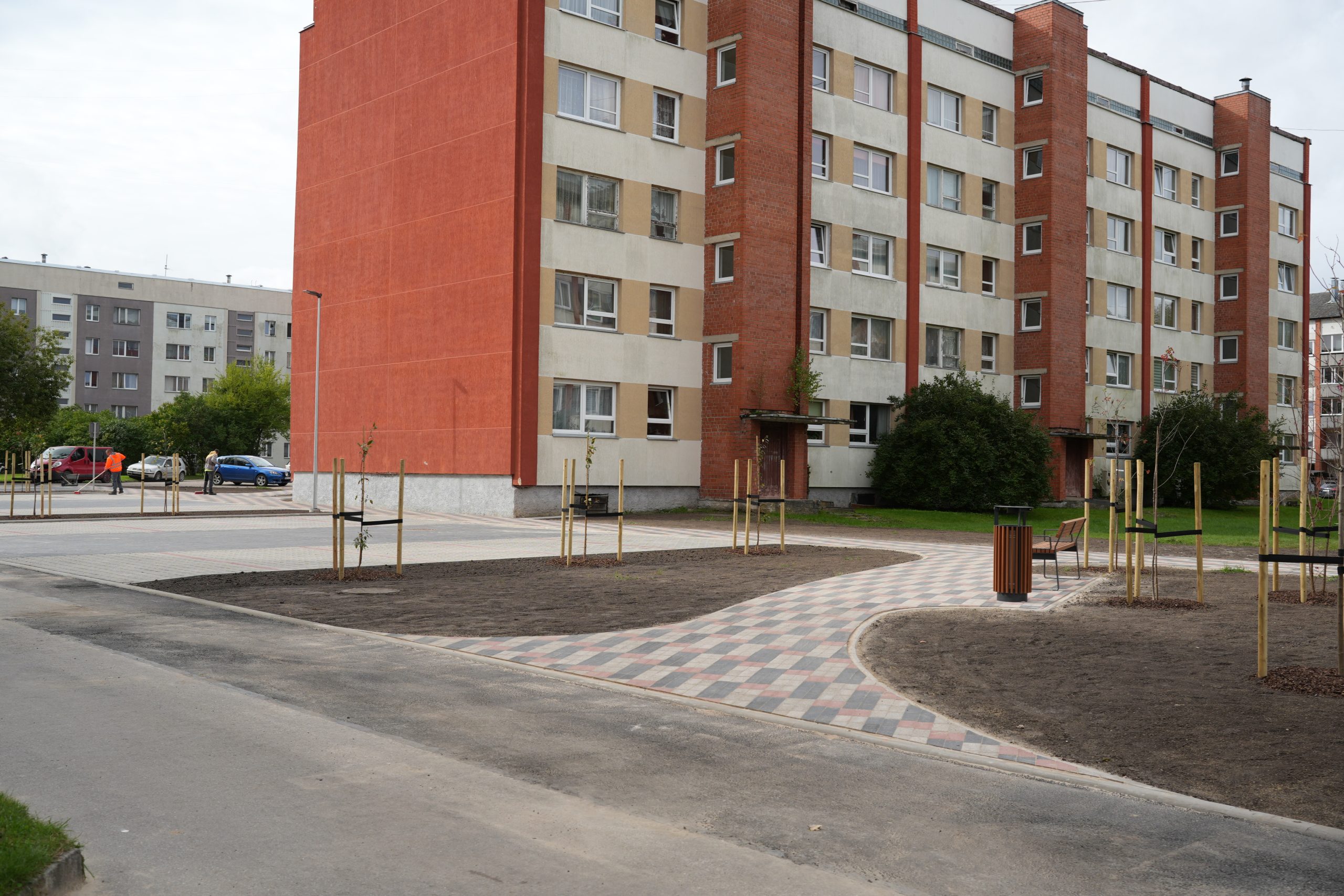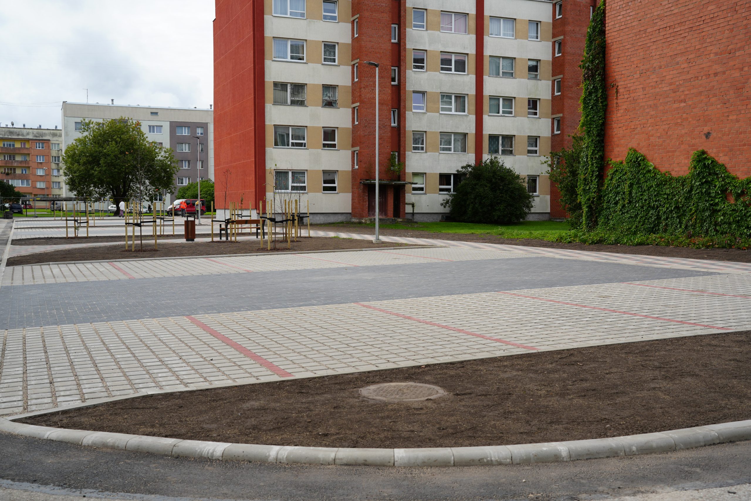 Stāvvietas un gājēju celiņi izbūvēti atbilstoši Vienotas Kuldīgas pilsētas daudzstāvu daudzdzīvokļu māju mikrorajonu pagalmu pilsētvides atjaunošanas, pārbūves un attīstības koncepcijai.