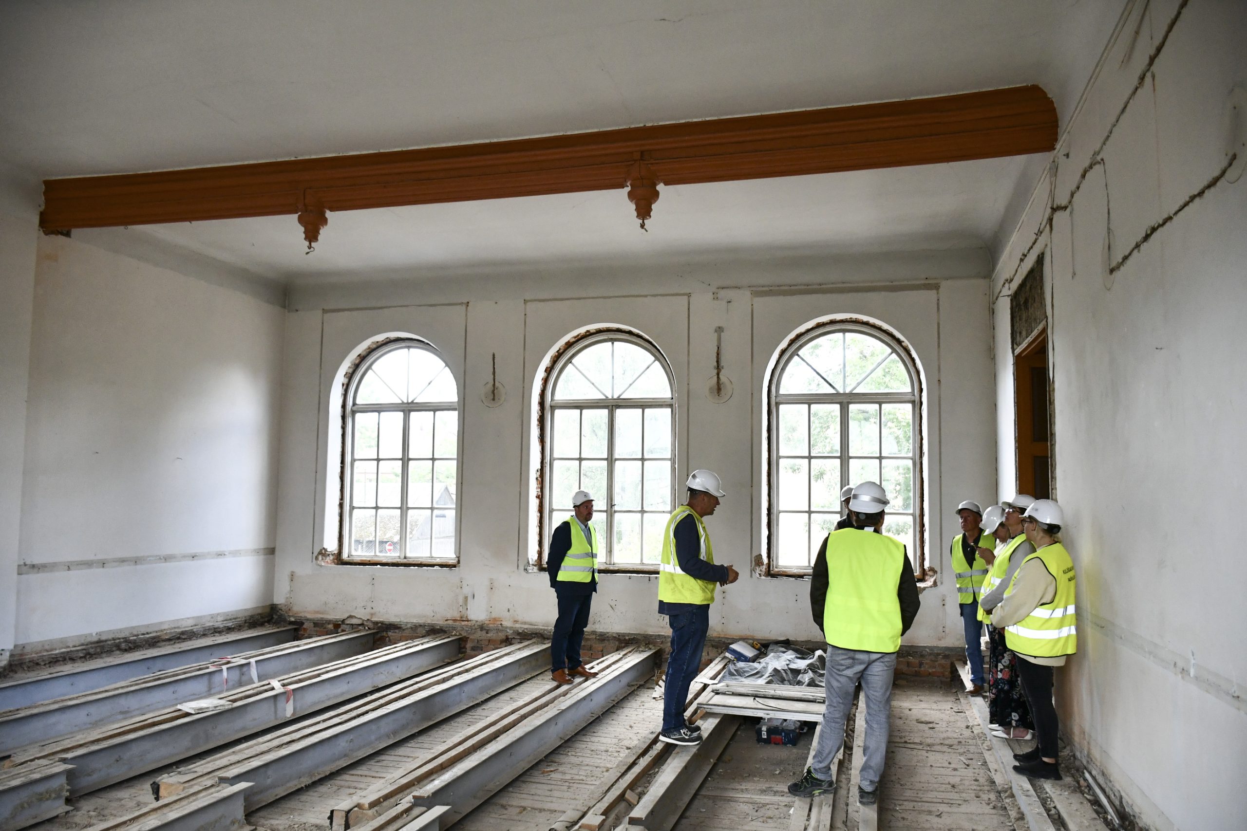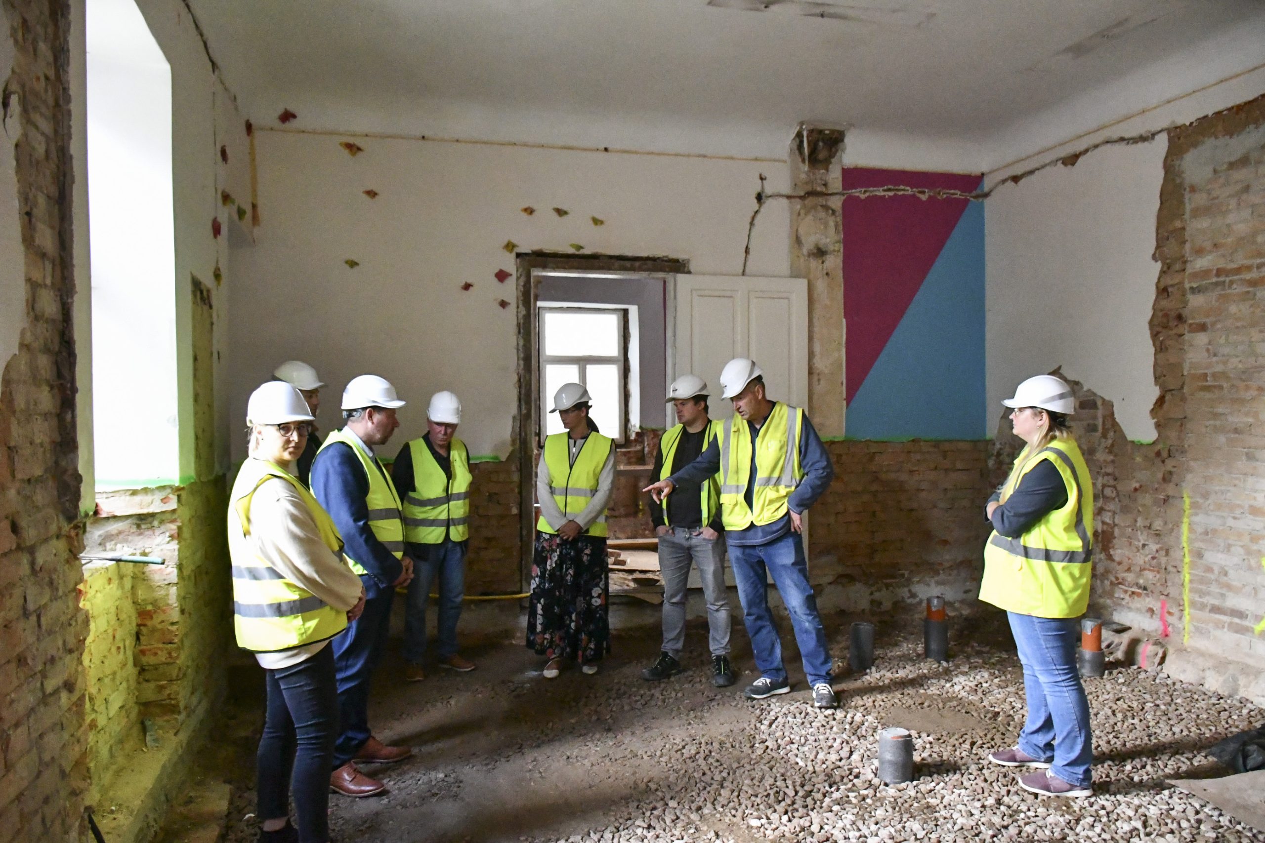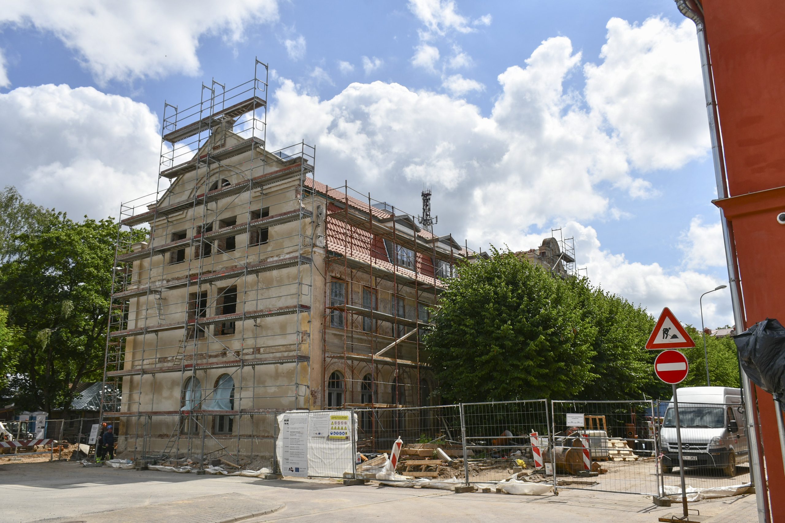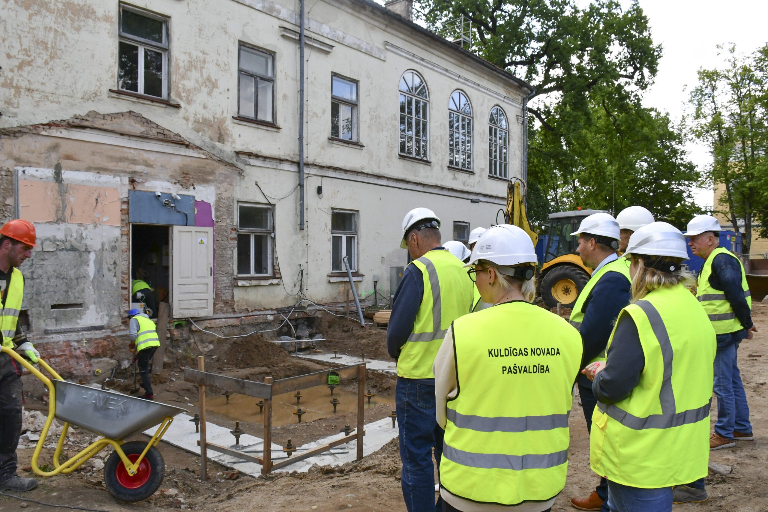 Objektā jau ir veikta esošo pamatu vertikālā hidroizolācija ar injekcijas metodi, mikropāļu izbūve, pamatu aizmūrēšana ar laukakmeņiem, un šobrīd notiek sagatavošanas darbi jumta seguma demontāžai.