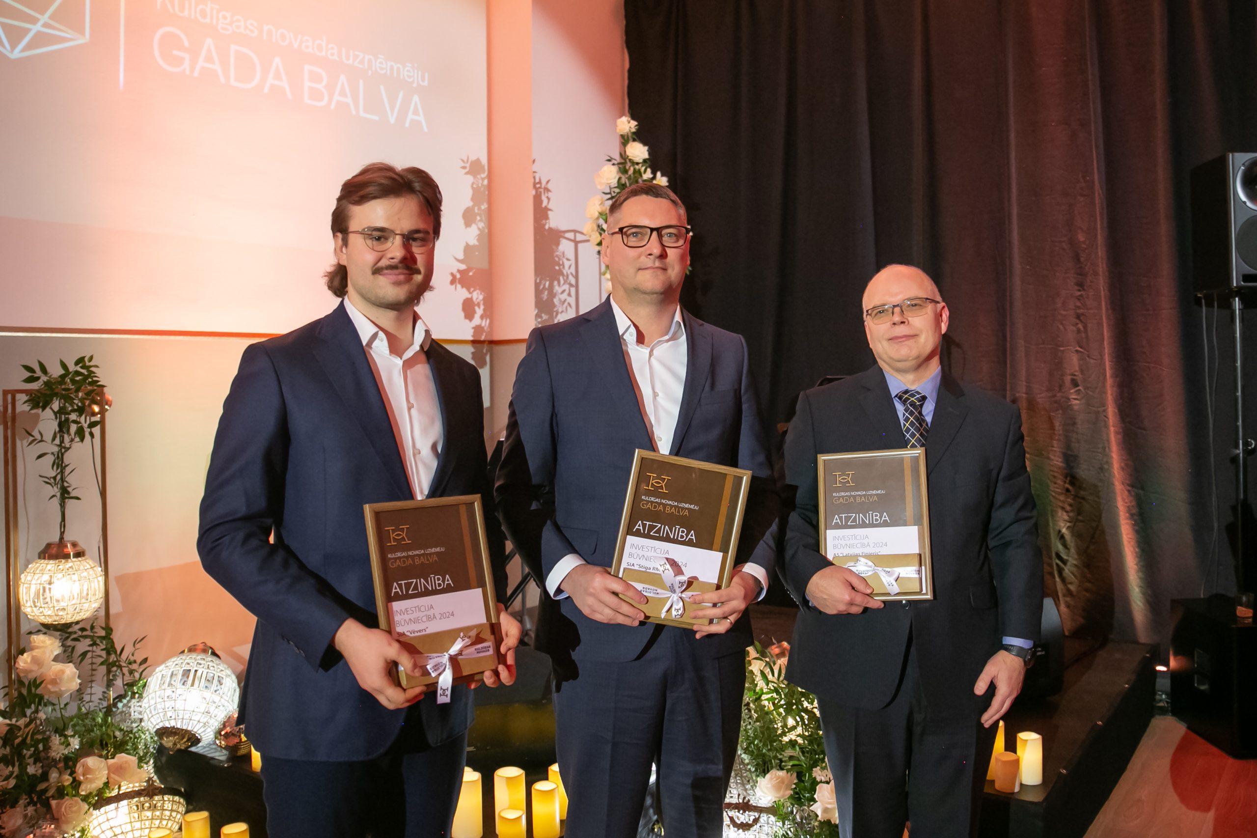Nominācijā “Novada investīcija būvniecībā 2024” pretendentus izvirzīja nevis iedzīvotāji, bet tika vērtēts uzņēmēju ieguldījums ēku būvniecībā, ražotnes un uzņēmuma attīstībā. Godinot uzņēmumus, kuru ēkas nodotas ekspluatācijā 2024. gadā ar finansiāli vislielāko ieguldījumu novada teritorijā un būtisku ieguldījumu savas uzņēmējdarbības vides attīstībā, balvas saņēma – AS “Latvijas finieris,” kurš pērn atvēris finiera ražotni Kuldīgā, SIA “Stiga RM,” kurš pārbūvējis ražošanas ēku, kā arī SIA “Vēvers,” kurš paplašinājuši ražošanu, investējot jaunas ražotnes, biroja ēkas un katlumājas būvniecībā.